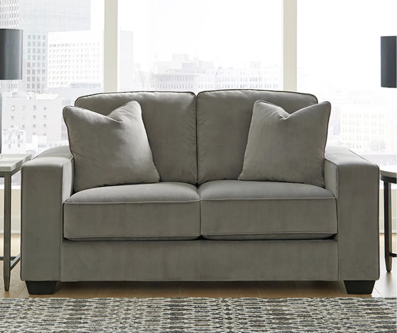 Serving up a refined, upscale look at an incomparable value price, this loveseat lures from every angle. Crisp, two-over-two cushion design, wide track arms and black tapered feet lend a clean, contemporary aesthetic. Velvety soft upholstery in a chic sandstone gray upholstery takes neutral to another level. Matching feather-filled throw pillows master the art of minimalism.