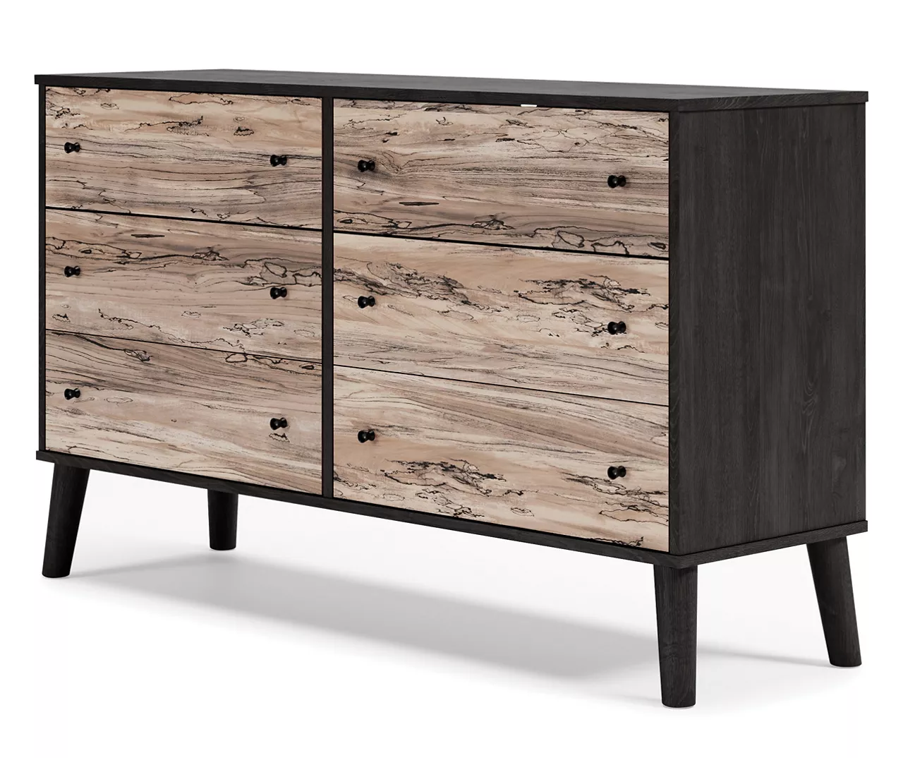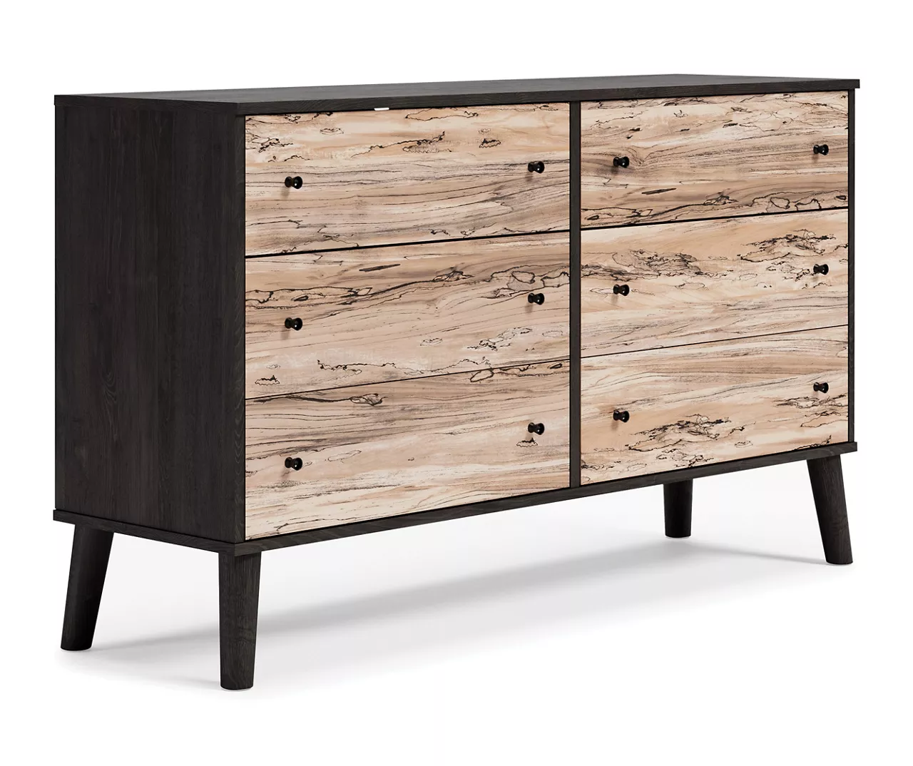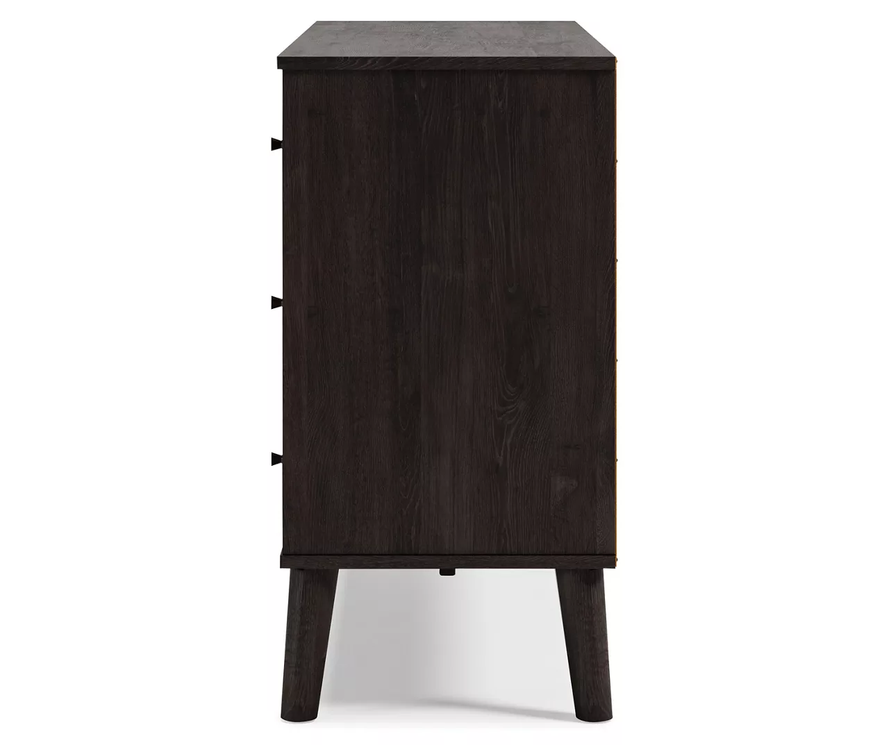 The perfect marriage of simple and contemporary style, this dresser is a charming addition to your home. An effortless blend of simple-yet-contemporary style, it features an expressive two-tone look with a dark charcoal finish over replicated oak grain for an authentic touch and a replicated sugarberry wood grain. Ball-bearing glides offer smooth opening and closing of the drawers, while matte black knobs and splay legs add a finishing touch.