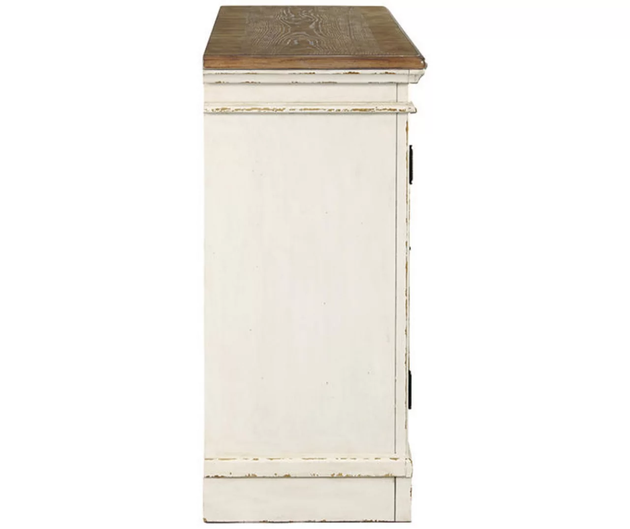 - Antiqued two-tone finish with chipped white base and distressed wood look top